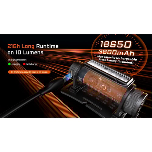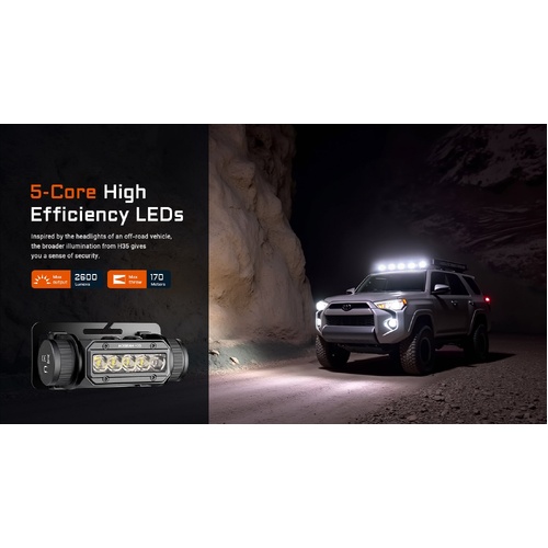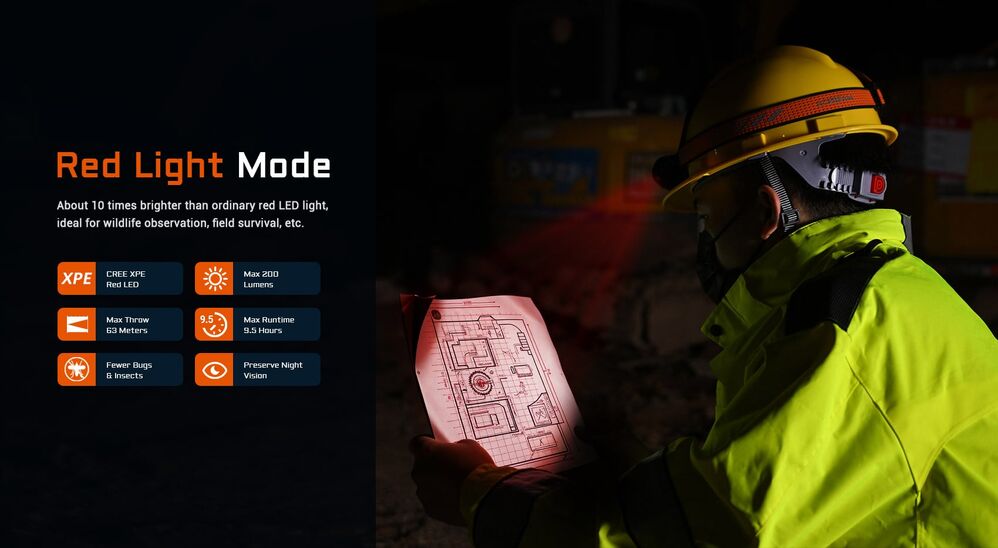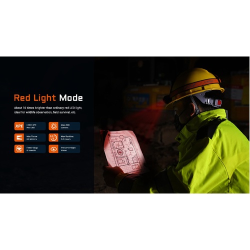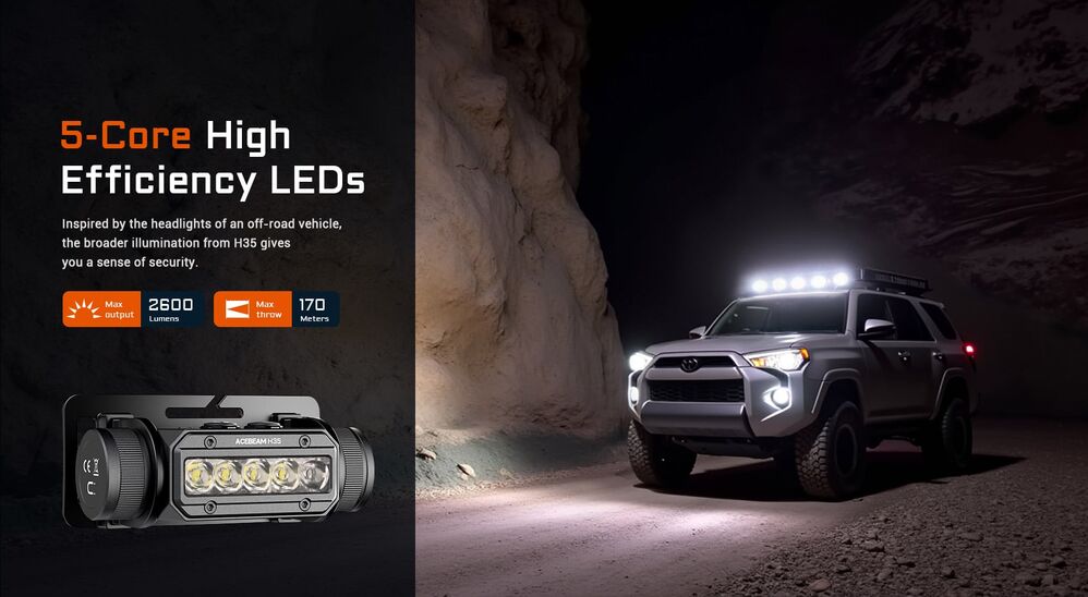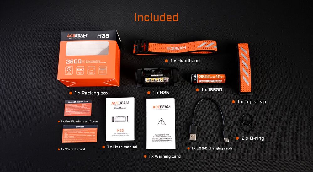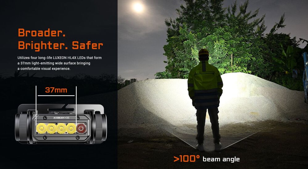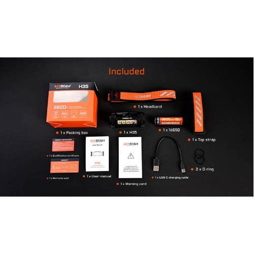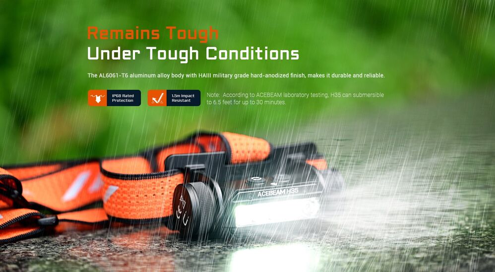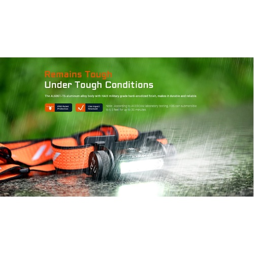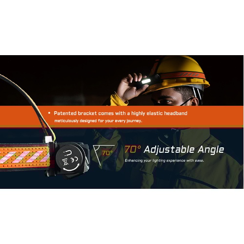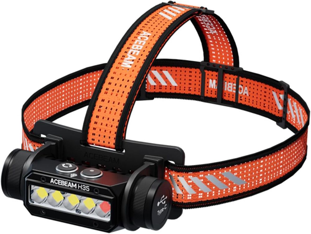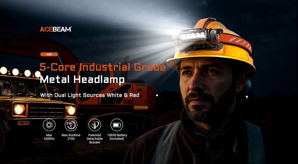 The ACEBEAM H35 is a high-performance headlamp designed for industrial and high-intensity tasks. Featuring dual light sources (red and white), it delivers a powerful 200 lumens red light with SOS functionality and a maximum white light output of 2600 lumens for wide-area illumination. With a runtime of up to 216 hours in ultra-low mode, it meets the demands of extended use. Powered by a single 18650 lithium-ion battery, the H35 features ACEBEAM’s patented bracket with 70° adjustable angles, allowing for flexible transitions between long-range and close-up lighting. With an IP68 waterproof rating and rugged durability, it is the ideal choice for industrial operations, search and rescue missions, and equipment inspections in demanding environments.