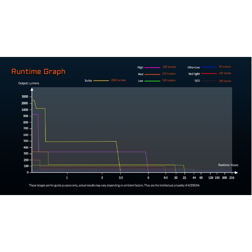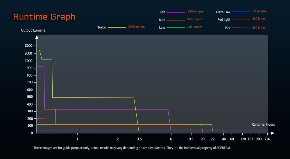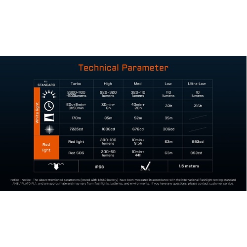 Turbo: 2600 ~ 1100 ~ 500 lumens; 7225cd; 170 meters; 60 seconds ~ 9min ~ 3H50minMax. output: 2600 lumens