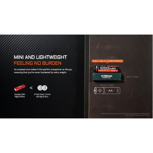 The Keylite 500 is a mini USB-C keychain light. Measuring just 2.38 in x 0.63 in x 0.41 in and weighing only 0.67 oz, this light is ultra-compact yet delivers up to 500 lumens, making it ideal for dark environments. Featuring a dual LED design, it provides a perfect balance of brightness and a soft glow, ensuring clear visibility without eye strain. Charging is simple with its USB-C port, so just plug it in for a quick recharge. Built for durability, the Keylite 500 is IP66 rated, making it dust-tight and resistant to powerful water jets. It can also withstand drops from up to 1.5 meters, ensuring reliability in tough conditions. Experience the convenience of portable lighting with the Keylite 500, the perfect companion for your daily life.