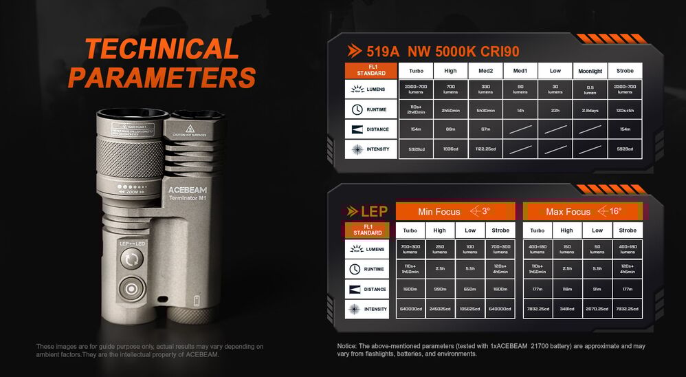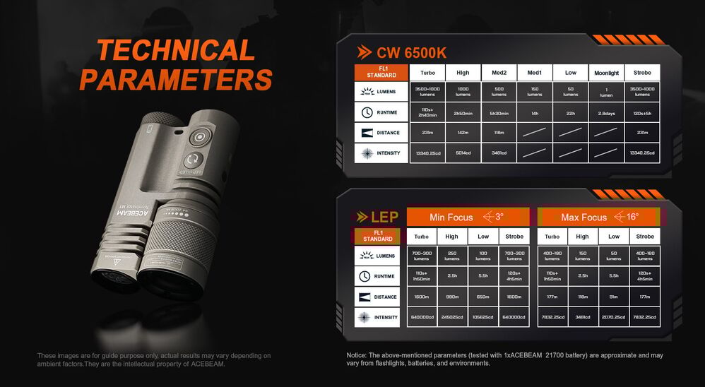 original 3481 candela; spinal distance 118 meters; lasts 530 hours/minutes; High Brightness Mode: 1000 lumens; density 5014 candela; gradient distance 1.42 meters; lasts 2 hours/50 minutes;